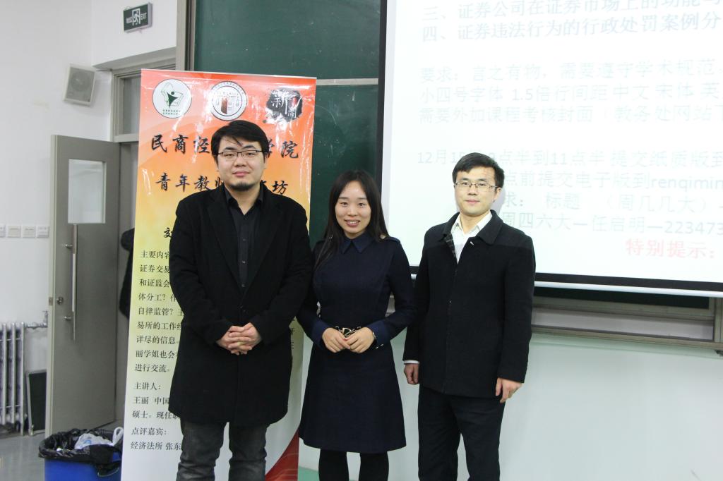 11月19日,由yl8cc永利青年教师工作坊主办,学院新闻中心承办的学术辅导专题讲座第三场在公司阶五教室举行。本次讲座主题为“交易所自律监管事务”,由青年教师工作坊成员、商法研究所教师任启明博士主持,深圳证券交易所市场监察部王丽主讲,工作坊成员、经济法研究所教师张东进行点评,共有200余名公司本科生参加。