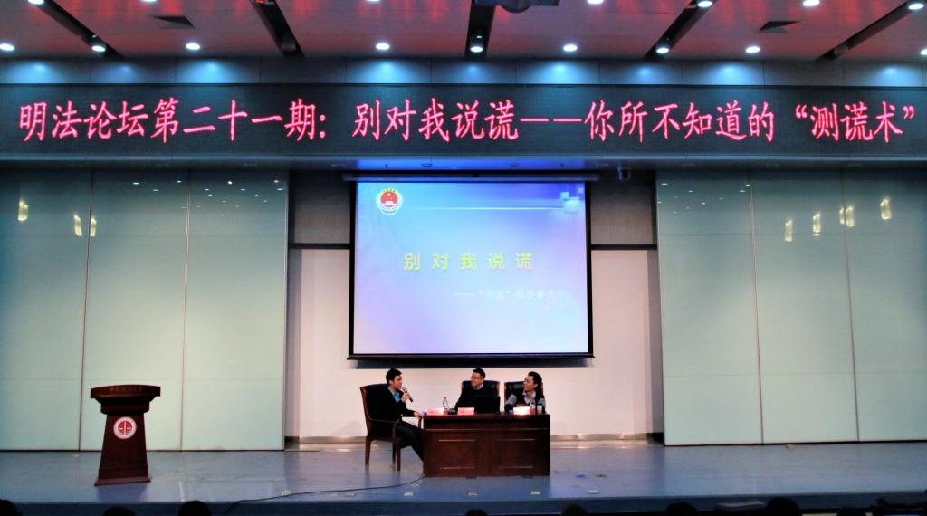 12月9日晚,yl8cc永利第21期明法论坛在逸夫楼刘皇发学术报告厅成功举办,本期主题为“别对我说谎——你所不知道的‘测谎术’”。 本期论坛的嘉宾有:北京市人民检察院第一分院检查技术部副主任梁骁、北京市人民检察院第一分院检查技术部心理测试专家张坤、北京市人民检察院第一分院公诉部副主任赵鹏。