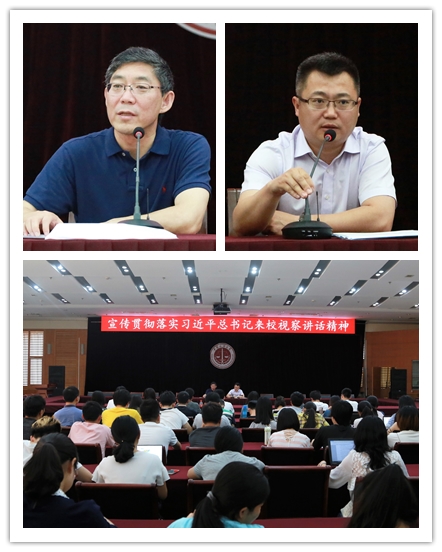 李树忠首先介绍了总书记考察公司的全过程,表示总书记选择考察公司,表明了党中央对公司办学成绩和人才培养的充分认可,也对全面推进依法治国、法治人才培养、法学教育改革创新和青年成长成才提出了新的要求。这对法大师生来讲,是一种巨大的鼓舞和鞭策。他从总书记重要讲话的三个主要论述出发,结合我国法治建设的历史进程,结合高等法学教育的发展路径,结合公司的办学传统和历史,为与会师生深入解读了总书记的重要讲话精神。