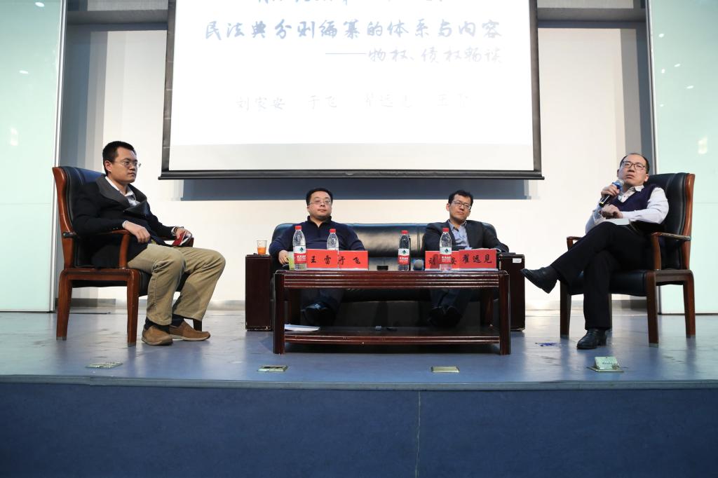 第一阶段,三位老师就总则对分则的体系效力、债总未来的发展可能等问题依次发表各自看法。刘家安老师认为,债总的编纂是极其必要的,而不可否认,合同法同样可以适用、左右其他债法规定,但就司法成本而言,债总则更为省事。物权与所有制相关联,涉及的不仅是少数棘手问题。相信物权法编草案将很快出台,2020年将依旧存在重修的必要。于飞老师借装拼家具时拧螺丝的原理阐述民法总则之于分则的体系效应,他主张,民法分则各编正式通过后应当对总则进行一定修订调整,力求做到协调配合。此外,与刘老师观点相似,他肯定债总的必要,立法上就应解决不必要的漏洞,以期减少实践争议。翟远见老师随后发言,他指出,法学家的专业水平深刻影响着民法编纂的体系化进程。债总的舍弃是为遗憾,物权制度需保持本土特色结合国际趋势的原则,与时俱进。
