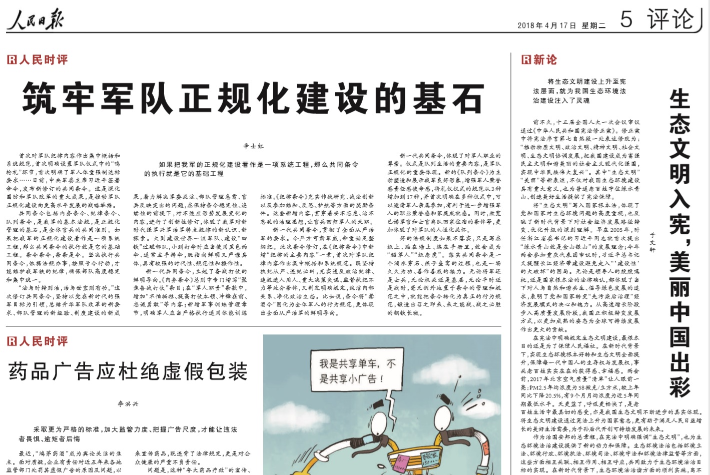 前不久,十三届全国人大一次会议审议通过《中华人民共和国宪法修正案》。修正案中将宪法序言第七自然段一处表述修改为:“推动物质文明、政治文明、精神文明、社会文明、生态文明协调发展,把我国建设成为富强民主文明和谐美丽的社会主义现代化强国,实现中华民族伟大复兴”。其中“生态文明”“美丽”等新表述,不仅对我国生态环境建设具有重大意义,也为普通老百姓守住绿水青山、创造美好生活提供了宪法保障。