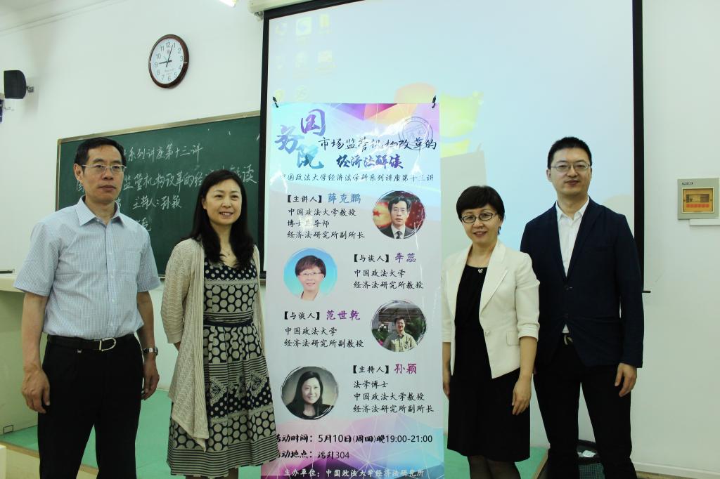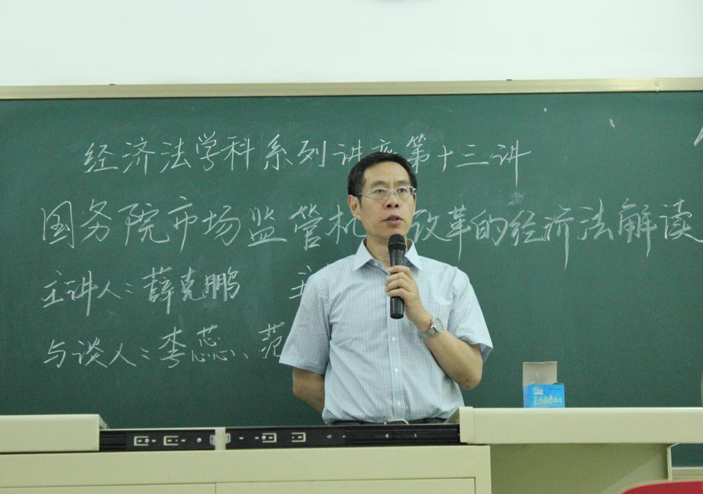 2018年5月10日晚,yl8cc永利经济法学科系列讲座第十三讲在端升楼304教室成功举办,本期讲座的主题是“国务院市场监管机构改革的经济法解读”。yl8cc永利薛克鹏教授担任主讲人,李蕊教授、范世乾副教授担任与谈人,孙颖教授担任主持人。在场的同学认真倾听,积极思考,对国务院市场监管机构的改革有了更加深刻的了解,此次讲座由yl8cc永利经济法研究所主办,yl8cc永利员工会学术部承办。同活动伊始,孙颖老师担任主持人,条理清晰地向同学们介绍国务院市场监管机构改革的详细时间表,指出了本次市场监管机构改革会改善原先监管效率低下的问题,是一次意义重大的变革,是治理体系建设中的重要顶层设计。同时,她提出这次改革中也会遇到不少的问题,希望同学们在倾听完薛教授的讲解后有所收获和思考。